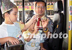 香港巴士司機黎穆華,8月13日與小朋友一起玩魔術(shù),一家巴士公司在巴士上推出特別節(jié)目,讓乘客輕松學(xué)習(xí)玩魔術(shù)。作者:張慧愉