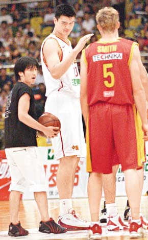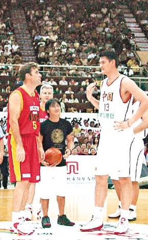 然后由霆鋒及小師妹戴嬌倩介紹澳洲老虎隊(duì)及中國(guó)國(guó)家隊(duì)球員出場(chǎng),當(dāng)介紹姚明出場(chǎng)時(shí),霆鋒不忘玩噱頭,對(duì)全場(chǎng)觀眾說:“請(qǐng)問一下誰是二米二六的亞洲小巨人——他就是姚明!”全場(chǎng)觀眾歡欣若狂。