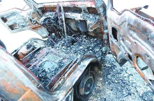 肇事的車子是0.6噸貨車,車上的擋風(fēng)玻璃已經(jīng)完全破碎,前兩輪胎處只剩下架子,方向盤只剩下圓形金屬,以及一把土制手槍、一把尖刀。值得一提的是,在車輛的殘骸上還有大量的塑料桶,有的是藍(lán)色,有的是白色,據(jù)一保安介紹,這些塑料桶是用來(lái)裝易燃液體的。昨天上午9時(shí)47分,一輛車身標(biāo)志是“刑事勘察車”的車輛駛?cè)氪逦瘯?huì)大院,從車上走下來(lái)數(shù)位警員,現(xiàn)場(chǎng)一共10多名警察不時(shí)交談著什么。最后警察將所有證物搬上車子后方離開(kāi)。