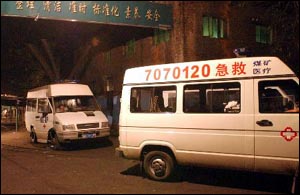 現(xiàn)場到處是救護(hù)車、警車、醫(yī)生、救護(hù)隊員。由于是國有大礦,一切救護(hù)工作都顯得井然有序。井口在一個不大的四方小院里,井口邊緣掛著燈,再往里看時,感覺到黑壓壓的很深。井口正對面的宣傳欄上,寫著“警鐘常鳴”,“實施安全生產(chǎn)法”等字樣。三礦醫(yī)院的副院長穿著白大褂,帶著20幾個醫(yī)護(hù)人員守侯在井口,據(jù)說井下還有4、5個醫(yī)護(hù)人員。據(jù)悉,到晚上22時,已經(jīng)有4批救護(hù)隊員下井勘察。