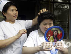 8月16日清晨,中國最后康復(fù)出院的SARS患者盧志艷在北京地壇醫(yī)院ICU病房護(hù)士長劉小冬幫助下精心梳妝準(zhǔn)備參加出院慶典儀式。盧志艷是北京小莊醫(yī)院藥劑師,4月25日感染SARS住院治療時間長達(dá)112天。中新社記者:任晨鳴