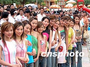 八月十七日,十二位二00三年度“準(zhǔn)香港小姐”在廣東新會溫泉谷進(jìn)行親善訪問活動,當(dāng)?shù)孛癖娂娂娳s來,一睹她們的靚麗風(fēng)采。中新社記者:劉衛(wèi)勇