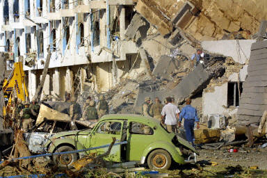 聯(lián)合國(guó)駐巴格達(dá)總部“運(yùn)河賓館”于19日發(fā)生了一起大爆炸,爆炸造成了數(shù)十人受傷,房屋受到嚴(yán)重毀損,兩層高的“運(yùn)河賓館”整整一個(gè)角被炸塌。