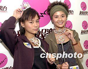 樂(lè)壇組合Twins兩名成員鐘欣桐(阿嬌)、蔡卓妍(阿Sa)(左起)8月20日在香港出席新城電臺(tái)節(jié)目《聯(lián)Fan所》之“愛(ài)菩私家訪”訪問(wèn),由于Twins新唱片于九月推出,電臺(tái)DJ送上玩具后冠、令牌,比喻港姐快將出爐。作者:鄧慶樂(lè)