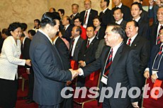 全國政協(xié)主席賈慶林二十一日在北京人民大會堂會見以余國春為團長的香港廣東社團總會訪京團。中新社記者:毛建軍