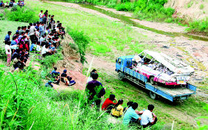 在現(xiàn)場(chǎng)看到,發(fā)生車禍地點(diǎn)是個(gè)轉(zhuǎn)彎處,道路旁有個(gè)陡坡,陡坡下是一個(gè)約10米高的懸崖。據(jù)知情者稱,這輛從吳旗到延安的客車駛到這里,與兩輛油罐車相會(huì)時(shí)突然墜入懸崖下的一條小河里,整個(gè)翻了過(guò)來(lái)。搶救者后來(lái)用鋼管等工具把客車翻過(guò)來(lái),才將旅客救出,但已有21人當(dāng)場(chǎng)死亡,傷者立即被送往延安大學(xué)附屬醫(yī)院進(jìn)行搶救。