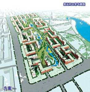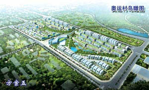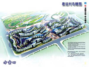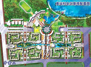 。牐犨@個設計方案把傳統(tǒng)的中國住宅規(guī)劃模式轉(zhuǎn)化為由奧運五環(huán)幻化而成的曲線,圓形升旗廣場象征“龍珠”。