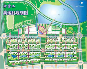 在這個方案中,奧運村布局按雙“喜”字分為四個組團,還設計了聯(lián)系奧運村中心區(qū)與北部森林公園之間的“景觀通廊”。