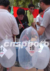 八月二十四日,北京一家避孕用品經(jīng)銷商在繁華的西單街頭向行人免費(fèi)派送安全套,許多市民大膽接受,忸怩之態(tài)并不多見。中新社記者:張煒