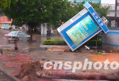 八月二十五日清晨,“科羅旺”臺風(fēng)襲擊海南省?谑小:?谑薪值辣姸酂粝涫綇V告牌被吹到在地。作者:蔣聚榮