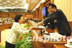 十屆全國人大常委會第四次會議今天上午在北京人民大會堂舉行,全國人大常委會副委員長李鐵映在會上主持了任命書頒發(fā)儀式。