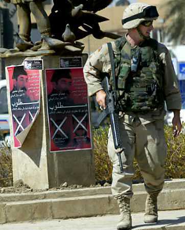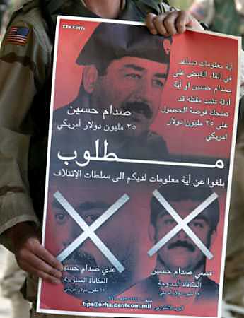 美軍士兵和伊拉克警察到處張貼懸賞捉拿薩達姆的海報時引來了眾多巴格達市民的圍觀。圍觀的人群當中對捉拿薩達姆一事各有各的看法,一名現(xiàn)年23歲的伊拉克牙科醫(yī)生海德爾·阿里表示:“我認為他們遲早會捉到薩達姆的,但有一些人似乎不知道任何有關(guān)這巨額獎賞的事!