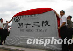 中新社北京八月二十八日電(記者吳慶才)今天,北京有關(guān)部門為上月被列入世界文化遺產(chǎn)名錄的明十三陵正式“樹碑立傳”,一塊坐落于明十三陵門戶——大紅門前的世界文化遺產(chǎn)標(biāo)志牌正式落成,并將成為十三陵特區(qū)新的標(biāo)志性景觀。