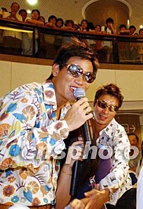 香港歌星蘇永康、許志安,8月31日在海港城為“香港安康演唱會”宣傳時,與現(xiàn)場歌迷高歌一曲,玩得開心。作者:洪少葵