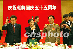 中國(guó)人民對(duì)外友好協(xié)會(huì)九月四日在北京舉行慶祝朝鮮建國(guó)五十五周年招待會(huì),中國(guó)全國(guó)人大常委會(huì)副委員長(zhǎng)烏云琪木格(左二)出席,并與朝鮮駐華大使崔鎮(zhèn)洙(左一)等一起舉杯共祝朝鮮國(guó)慶。中新社記者:毛建軍