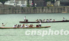 “2003年澳門亞太城市龍舟邀請(qǐng)賽”開(kāi)鑼在即,六日已有部分參賽隊(duì)伍在南灣湖冒雨練兵。中新社記者:李剛