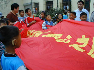 滄州聾啞學校的孩子們觸摸愛心——“愛心之旅”采訪團受到聾啞兒童的歡迎。華夏時報圖