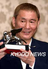 中新網(wǎng)9月10日電 在第60屆威尼斯國際電影節(jié)上以古裝片《座頭市》榮獲最佳導(dǎo)演獎(jiǎng)的日本導(dǎo)演北野武(Kitano Takeshi)8日在東京舉行記者招待會(huì),從當(dāng)天回國的北野事務(wù)所的森昌行社長(zhǎng)手里接過銀獅獎(jiǎng)杯。