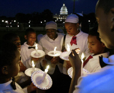 10日晚,在美國(guó)華盛頓國(guó)會(huì)大廈前,一教會(huì)的孩子們點(diǎn)燃蠟燭將以守夜方式紀(jì)念“9·11”這個(gè)另美國(guó)人難以忘記的慘痛事件。與此同時(shí),這種自發(fā)的守夜活動(dòng)還將在美國(guó)全境展開。