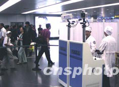 北京首都國際機(jī)場九月下旬重啟防非典監(jiān)察臺,醫(yī)護(hù)人員在乘客入口處的體溫自動監(jiān)測儀后值班,嚴(yán)防即將到來的黃金假期千千萬萬人流中發(fā)生疫情。中新社記者:賈國榮