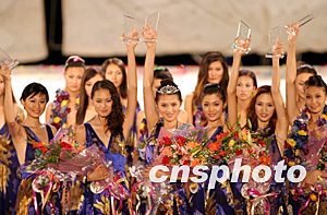 2003年新絲路模特大賽總決賽十四日晚在三亞天涯海角舉行,五十一名佳麗參加角逐。來自湖南的肖青獲得冠軍(左三),谷雨(左二)、姚瑤(左四)獲得亞軍,吳育臻(左一)、張小雯(左六)、羅君(左五)獲得季軍。中新社記者:毛建軍