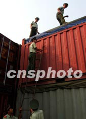 遼寧丹東港邊防檢查站的解放軍九月在丹東市大東港碼頭對(duì)集裝箱進(jìn)行檢查。這個(gè)港口與韓國和日本貨運(yùn)交往每年大幅遞增,由于偷渡人員采用集裝箱躲藏現(xiàn)象較多,邊防武警十分注重對(duì)集裝箱的檢查。中新社記者:王麗南