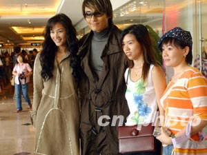 愛情偶像劇《真情告別》主角胡兵和瞿穎首次以“自由行”方式來港,以游客身份在尖沙咀商場購物,圖為游客與二人合影。中新社記者:錢興強(qiáng)