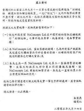 (一)該文所指有關(guān)NuConcepts Ltd.在中環(huán)開(kāi)設(shè)的家俬店鋪被銀行“封鋪?zhàn)纷狻敝录^無(wú)其事,純屬捏造,毫無(wú)事實(shí)根據(jù);(二)在NuConcepts Ltd.重組業(yè)務(wù)的期間,已為所有客戶(hù)就提取及送遞已訂購(gòu)的貨品作好妥善的安排,以確保所有客戶(hù)均能順利提取已訂購(gòu)之貨品;(三)朱先生與一眾NuConcepts Ltd.之員工一直保持緊密的聯(lián)系,并每天均與其大部分員工保持溝通及接觸。就NuConcepts Ltd.重組的細(xì)節(jié)方面,朱先生一直有向員工作出清楚及詳細(xì)的交代。