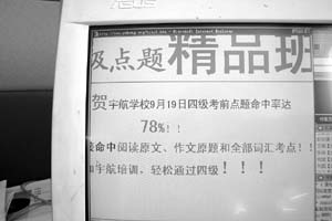 據(jù)《京華時(shí)報(bào)》報(bào)道,北京某高校剛剛參加完英語(yǔ)四級(jí)考試的小鮑反映,前天,不少同學(xué)在地質(zhì)大學(xué)看到當(dāng)晚在該校將舉行“四級(jí)考試考前點(diǎn)題培訓(xùn)”的海報(bào),入場(chǎng)券50元,舉辦方為北京宇航考試培訓(xùn)學(xué)校!斑@次培訓(xùn)點(diǎn)中了試題中大概50分的內(nèi)容!”