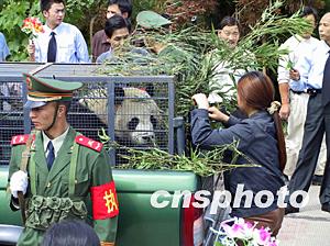 中午二時(shí)許,八只國(guó)寶大熊貓抵達(dá)雅安碧峰峽研究基地,藏漢民眾和碧峰峽研究基地的工作人員手持鮮花、彩旗隆重夾道歡迎國(guó)寶平安抵達(dá)。歡迎儀式結(jié)束之后,八臺(tái)大熊貓專(zhuān)車(chē)往新居行近,武警戰(zhàn)士將這八只大熊貓?zhí)нM(jìn)了它們的“豪華別墅”。這八只大熊貓忽閃忽閃的眼神,顯示著它們的新奇與不安。畢竟這是一個(gè)陌生的世界。大熊貓遷入新居時(shí),一些大熊貓發(fā)怪叫聲,有的在房里轉(zhuǎn)來(lái)轉(zhuǎn)去,但是,當(dāng)護(hù)養(yǎng)人員將竹子、蘋(píng)果送給它們吃時(shí),即刻恢復(fù)了常態(tài)。