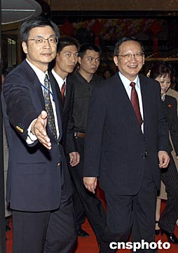 國(guó)務(wù)委員唐家璇(右)二十一日在長(zhǎng)沙接見(jiàn)參加“第二屆世界華文傳媒論壇”的代表,中國(guó)新聞社副社長(zhǎng)劉北憲(左)迎接。中新社記者:張宇