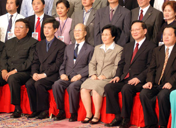 國(guó)務(wù)委員唐家璇(右二)二十一日接見(jiàn)“第二屆世界華文傳媒論壇”與會(huì)代表并合影留念。中新社 張宇 攝