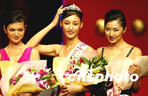 來自吉林的二十一歲大學(xué)生關(guān)琦脫穎而出獲得冠軍。中新社記者:毛建軍  第五十二屆世界小姐比賽第五名、亞洲美皇后吳英娜為關(guān)琦戴上桂冠。中新社記者:毛建軍