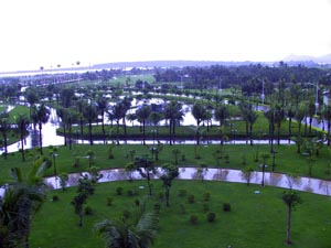 事實上,當(dāng)記者站在酒店總統(tǒng)套房的大露臺上,心曠神怡的感覺真是撲面而來。在這個露臺上俯瞰酒店的生態(tài)泳池,綠色的島嶼小品與棕色木質(zhì)燒烤回廊講述著回歸自然的故事;視野穿過起伏的高爾夫球場,可以遠(yuǎn)眺南中國海的碧波。一條被河流沖積泥沙與外海海浪共同作用而成的沙堤——玉帶灘,蜿蜒三公里將萬泉河、龍滾河、九曲江三江入?诜殖闪藘(nèi)外咸淡兩海,其中內(nèi)海之中形成若干個小島,在眼前演繹著豐富而多變的江、河、湖、海、島嶼、山脈的水域景觀。