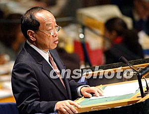 中國(guó)外長(zhǎng)李肇星九月二十四日在第五十八屆聯(lián)大一般性辯論中發(fā)言時(shí)表示,為了維護(hù)世界和平,促進(jìn)共同發(fā)展,應(yīng)該加強(qiáng)國(guó)際合作,走多邊主義道路,促進(jìn)世界多極化。中新社記者:趙海燕