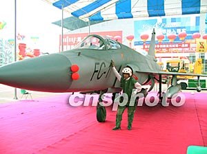 “梟龍”殲擊機亮相25日開幕的第四屆中國西博會。這架“梟龍”飛機模型是根據(jù)真實的“梟龍”殲擊機以一比一的比例制造而成。圖為一市民穿著飛行員制服與“梟龍”殲擊機親密接觸。作者:陳雯