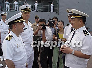 美國(guó)艦艇編隊(duì)于九月二十六日上午結(jié)束對(duì)中國(guó)南海艦隊(duì)的訪問離開湛江港。圖為中國(guó)南海艦隊(duì)參謀長(zhǎng)侯月喜少將與美艦艦長(zhǎng)話別。作者:李小軍