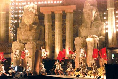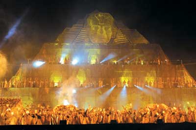 夜色中,雄偉的埃及金字塔在絢麗的燈光映襯下顯得格外迷人。歡呼的人群,凱旋的勇士,齊放的禮花,昨晚工體數(shù)萬觀眾在這里領(lǐng)略了世界上最大場(chǎng)面的演出。