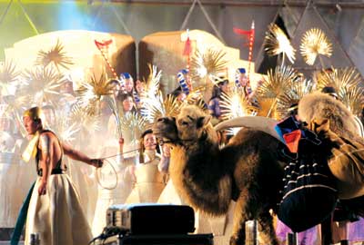 當(dāng)晚演出的高潮出現(xiàn)在第二幕第二場(chǎng)。在雄壯有力的凱旋進(jìn)行曲聲中,兩千名由武警戰(zhàn)士扮演的身穿戰(zhàn)袍的勇士邁著整齊的步伐走過這個(gè)世界上最大的舞臺(tái),上千名歡慶勝利的群眾在舞臺(tái)上載歌載舞,而繳獲的戰(zhàn)利品——駱駝、老虎、獅子等動(dòng)物明星們的出場(chǎng)以及在體育場(chǎng)看臺(tái)四周齊放的絢麗的煙花更增添了歡慶的節(jié)日氣氛。這時(shí),工人體育場(chǎng)一下子沸騰了,觀眾們被眼前盛大的場(chǎng)景深深感染了,臺(tái)上臺(tái)下歡呼聲響成一片,首屆北京國(guó)際戲劇演出季掀起了第一個(gè)高潮。