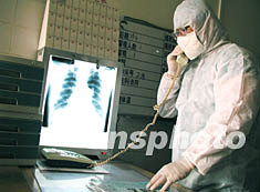 二十八日下午,廣東肇慶舉行防SARS應(yīng)急演練,以便在國(guó)慶黃金周來(lái)臨之際做好非典防治工作。圖為演練中醫(yī)生及時(shí)向上級(jí)部門(mén)報(bào)告SARS疫情。作者:黃耀輝