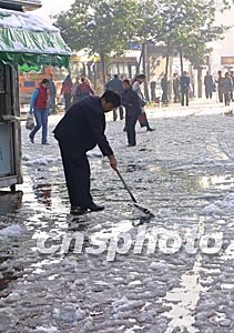 二十七日晚,受冷空氣影響,入秋以來的第一場降雪悄然光臨烏魯木齊市。二十八日一早,市民及時清理道路上的積雪,方便行人出行。作者:劉新