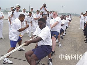 23日,中美海軍首先進(jìn)行了拔河友誼比賽。拔河比賽應(yīng)該說(shuō)是中國(guó)海軍水兵的強(qiáng)項(xiàng),在97年南海艦隊(duì)對(duì)美洲四國(guó)五港的訪問(wèn)中,中國(guó)海軍水兵拔河隊(duì)一路上攻城拔寨、未嘗敗績(jī)。但這次美國(guó)水兵拔河隊(duì)是有備而來(lái),且來(lái)者不善。15名隊(duì)員個(gè)個(gè)膀大腰圓、粗壯結(jié)實(shí),比如,其中一名黑人隊(duì)員桑塔納(SANTANA),此人身高199CM,體重250斤,來(lái)自美國(guó)亞特蘭大,是艦上的武器部門人員。中方隊(duì)員與對(duì)手相比在塊頭上明顯吃了虧,處于劣勢(shì)。比賽開始前,美方隊(duì)員圍在一起,大聲鼓勁。比賽開始后,中方水兵拔河隊(duì)奮力與對(duì)手展開拉鋸戰(zhàn),雖拼盡全力,無(wú)奈實(shí)力稍遜一籌,最后不無(wú)遺憾地輸?shù)舯荣,美?guó)水兵也算報(bào)了上次比賽的一箭之仇。