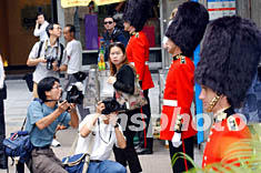在國(guó)慶黃金周之際來香港 “自由行”的內(nèi)地游客,10月6日在中環(huán)鬧市巧遇國(guó)泰航空推廣活動(dòng),紛紛把握機(jī)會(huì)與英國(guó)衛(wèi)兵合影,顯得興高采烈。作者:統(tǒng)計(jì)員