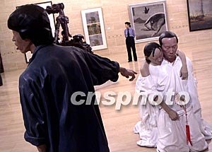 北京十月的國際藝術(shù)雙年展上,一件表現(xiàn)悲劇情節(jié)的雕塑標(biāo)新立異,令人深思。中新社記者:賈國榮