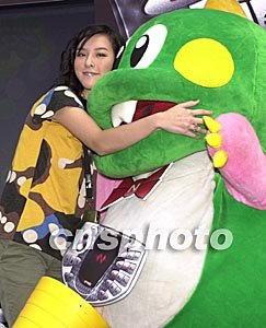 歌星李蘢怡10月7日在香港出席諾基亞N-Gage手提游戲機(jī)推廣活動,擁抱可愛的卡通人物“泡泡龍”。作者:鄧慶樂