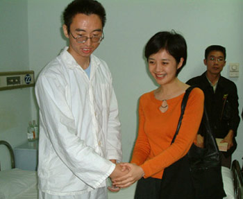 9月26日下午,帶病堅(jiān)持工作的鳳凰衛(wèi)視知名女主播、“華夏愛(ài)心團(tuán)愛(ài)心專(zhuān)員”許戈輝,手捧鮮花,來(lái)到空總血液科病房慰問(wèn)干海濤,并現(xiàn)場(chǎng)捐贈(zèng)了一萬(wàn)元,表達(dá)自己的愛(ài)心,祝愿海濤早日康復(fù)。北京太陽(yáng)宮房地產(chǎn)有限公司總經(jīng)理韓國(guó)建也代表華夏愛(ài)心團(tuán)捐助了現(xiàn)款,并邀請(qǐng)海濤在“牽手愛(ài)心墻”的采集印上按下了自己的手印。