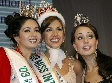 10月8日,在日本東京舉行的2003年國(guó)際小姐決賽中委內(nèi)瑞拉小姐阿蘇婭(中)獲得冠軍、印度小姐(左)獲亞軍、芬蘭小姐獲季軍。