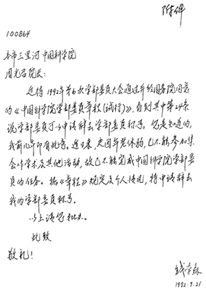 錢學(xué)森1955年回國,1957年被增選為中國科學(xué)院學(xué)部委員(1994年改稱中國科學(xué)院院士)。錢老當(dāng)然十分珍視中國科學(xué)界給他的這一榮譽,并積極參加中國科學(xué)院學(xué)部委員的各種學(xué)術(shù)活動。但到晚年,當(dāng)他行走困難,不便參加學(xué)術(shù)活動以后,便給當(dāng)時的中國科學(xué)院院長周光召寫信,主動申請辭去學(xué)部委員的稱號(錢老給周光召的信附后)。