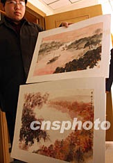 中貿(mào)圣佳國(guó)際拍賣公司2003年拍賣會(huì)將于十一月一日在北京舉行,傅抱石作品《毛主席詩(shī)意山水冊(cè)八開》等稀罕珍品成為拍品中一道靚麗風(fēng)景。該畫作由傅抱石先生在1964、1965年內(nèi)為生前摯友維楨所繪,是作者經(jīng)心閱讀《毛澤東詩(shī)詞》后激情創(chuàng)作的八幅佳構(gòu)。圖為工作人員十月中旬展示其中的兩幅《寥廓江天萬(wàn)里霜》(下)與《芙蓉國(guó)里盡朝暉》。中新社記者:武仲林