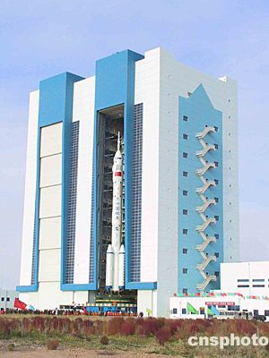 被稱為“亞洲第一門(mén)”的酒泉衛(wèi)星發(fā)射中心載人航天發(fā)射場(chǎng)總裝測(cè)試廠房大門(mén)開(kāi)啟后,“神舟”五號(hào)載人飛船船箭塔組合體開(kāi)始向發(fā)射塔架垂直轉(zhuǎn)運(yùn)。中新社記者孫自法攝